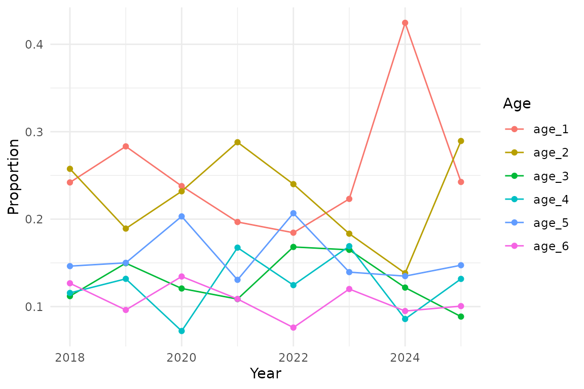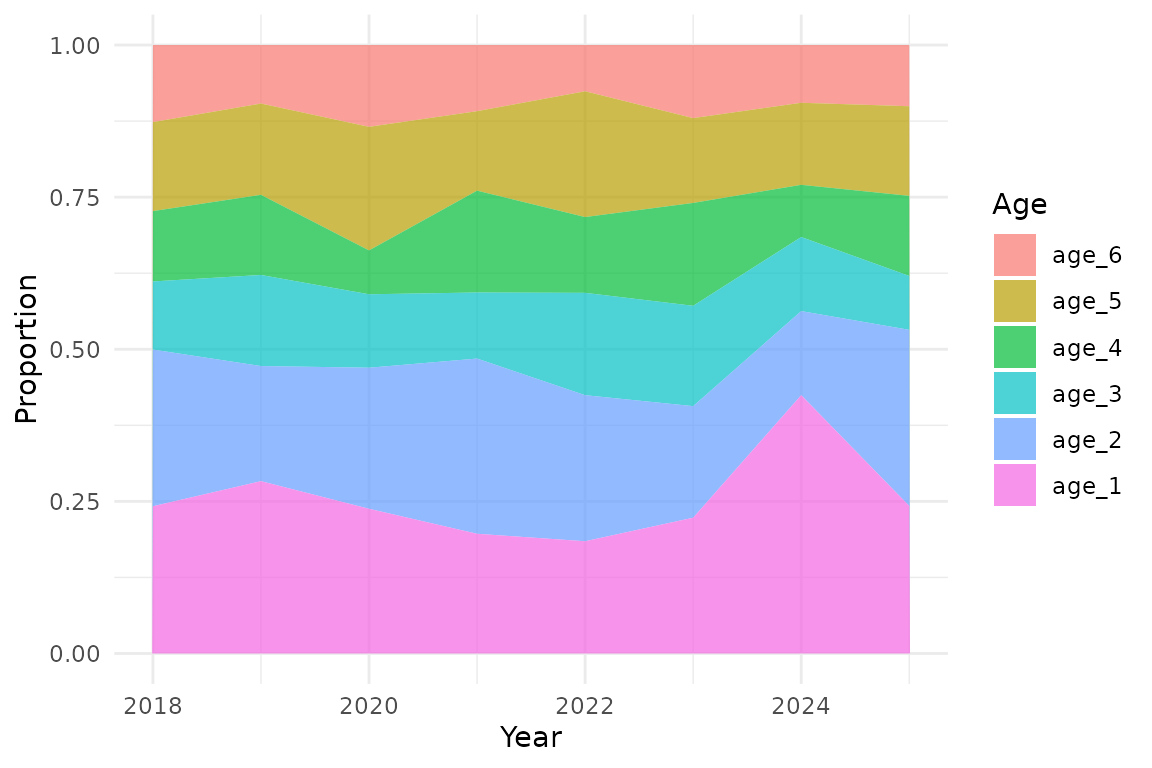 Thorson, J.T., and Haltuch, M.A. 2018. Spatio-temporal analysis of compositional data: increased precision and improved workflow using model-based inputs to stock assessment. Can. J. Fish. Aquat. Sci. doi:10.1139/cjfas-2018-0015.