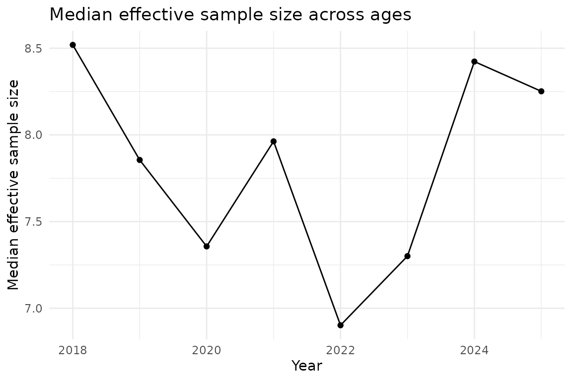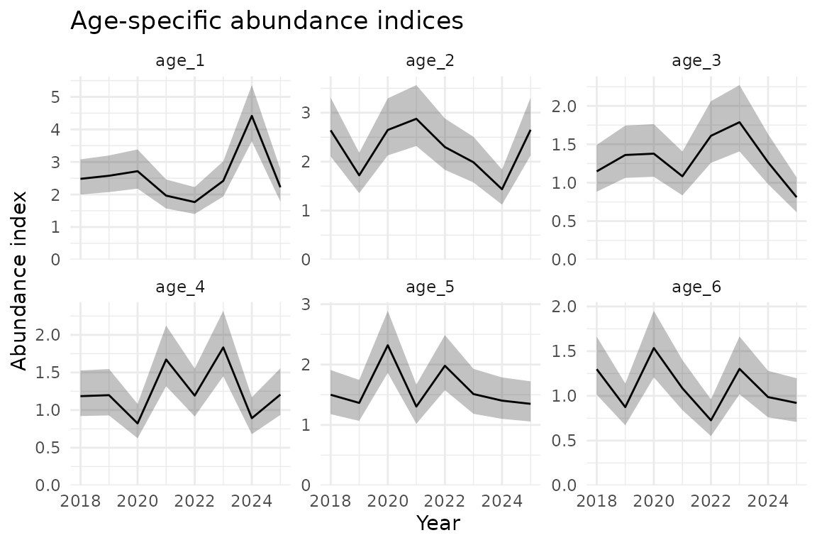 #> 6 2018 0.0455565 0.04583463 0.86470310 age_1 2018_age_1We are assuming that these data have already gone “first stage expansion”. I.e., each subsample has been expanded to represent the total abundance (or biomass) of the primary sample from which it came. Although we model abundance per area here, we could alternatively model abundance with an offset for (log) area. And instead of a Tweedie distribution, we could use a delta-gamma or delta-lognormal family or even a Poisson or negative binomial.