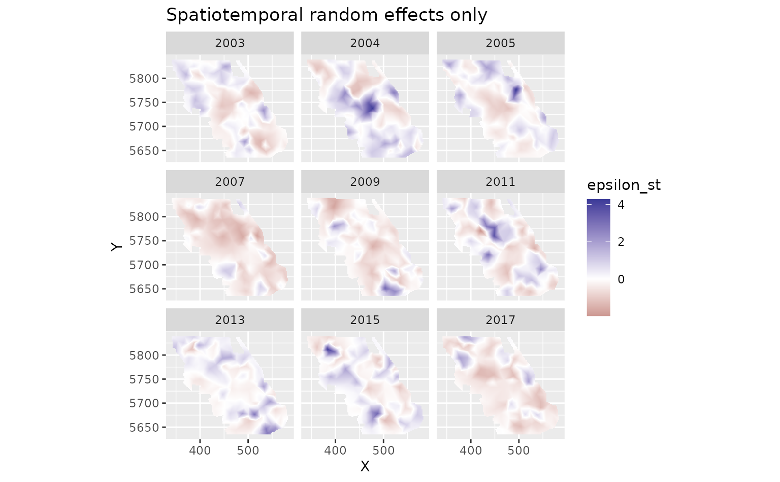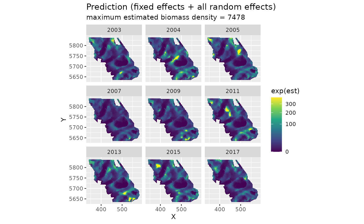 In this vignette, we describe the basic steps to fitting a spatial or spatiotemporal GLMM with sdmTMB. The goal is to show how to (i) build a mesh that captures spatial structure, (ii) fit increasingly rich models (GLM → spatial → spatiotemporal), (iii) interpret coefficients and random fields, and (iv) check predictions/uncertainty. These models are useful for (dynamic, i.e. changing through time) species distribution models and relative abundance index standardization among many other uses. See the model description for full model structure and equations.