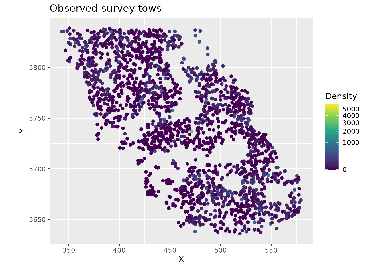 We will use built-in package data for Pacific Cod from a fisheries independent trawl survey (kg caught, swept area, and tow time).