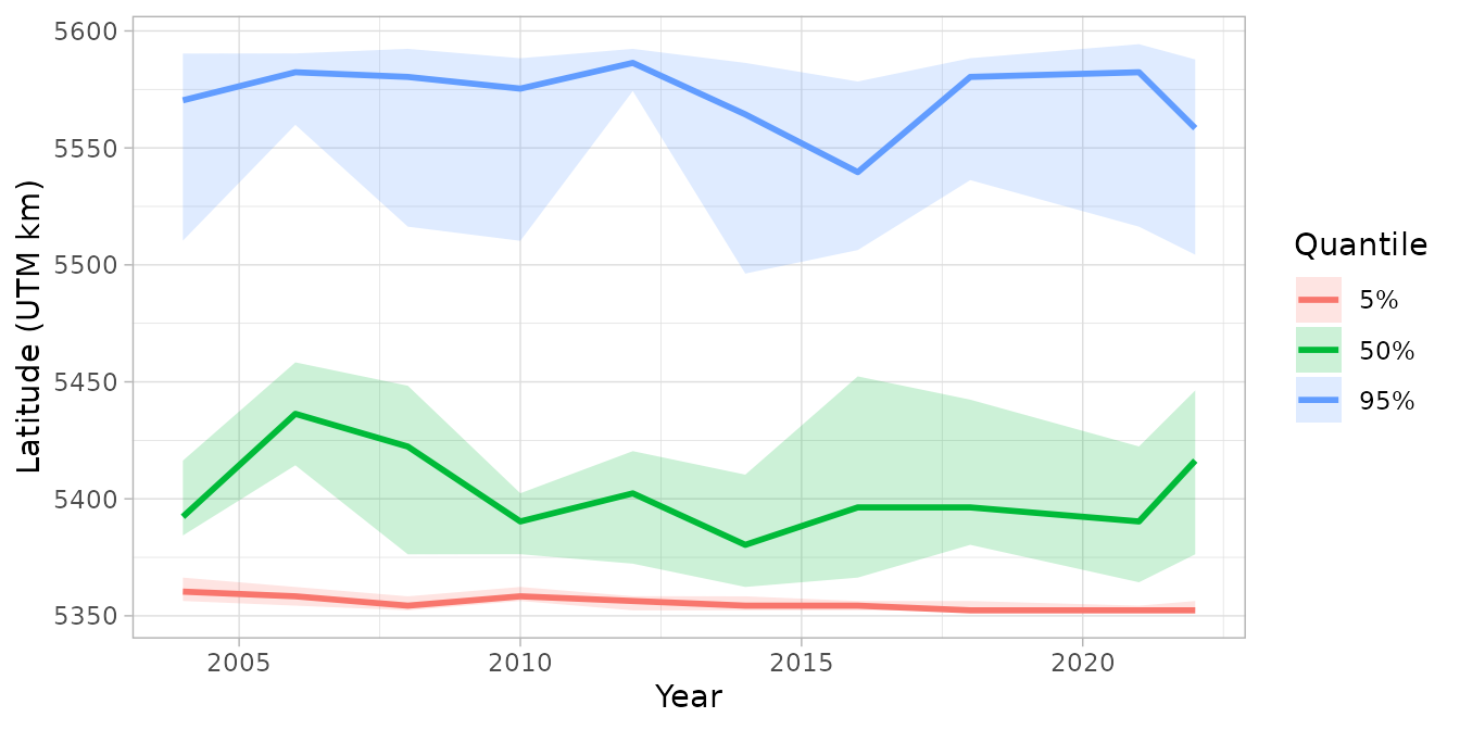 This plot shows how the northern and southern range edges of dogfish have shifted over time, with uncertainty bands reflecting sampling and estimation uncertainty. The median line represents the center of the distribution.
