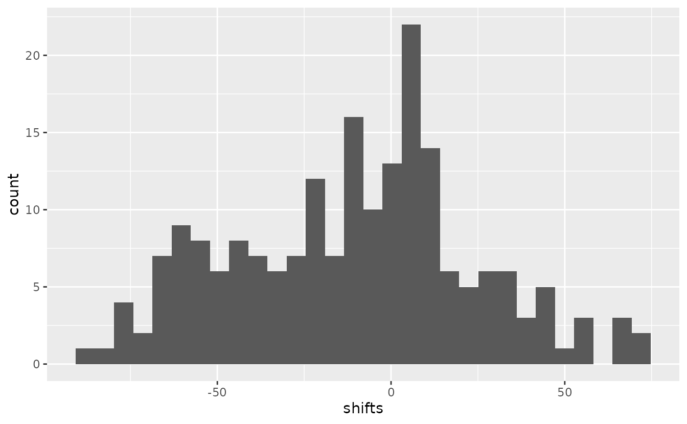 ggplot(data.frame(shifts = shifts), aes(shifts)) + geom_histogram()