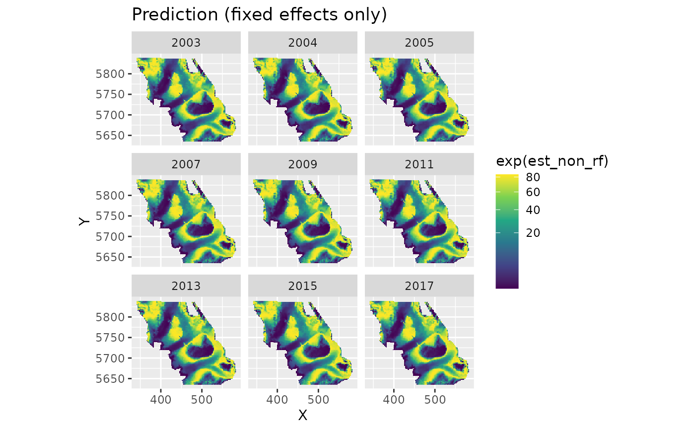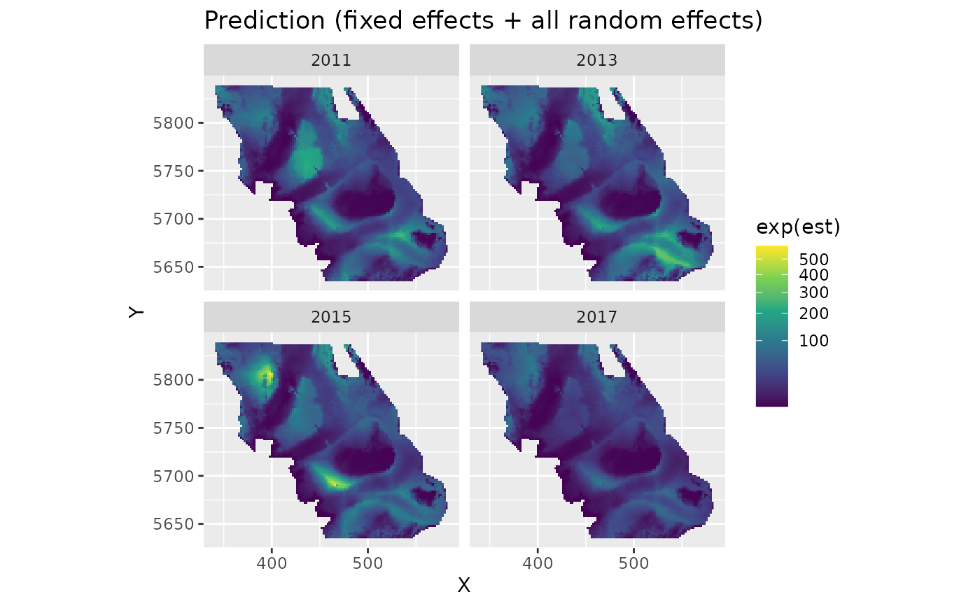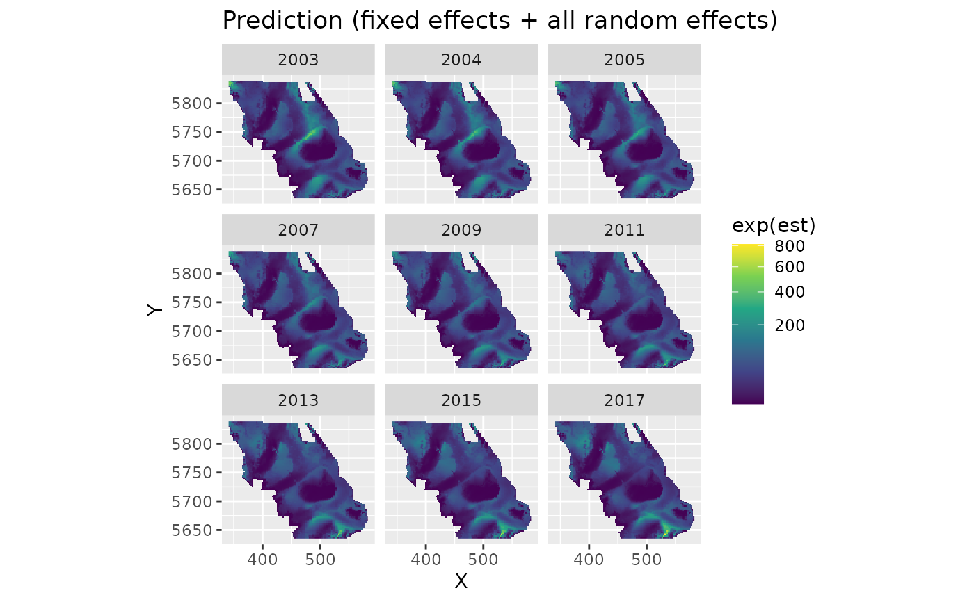 > 0, simulate from the joint precision matrix withnsimdraws. Returns a matrix ofnrow(newdata)bynsimwith each column representing one draw of the linear predictor (in link space). Simulating from the joint precision matrix accounts for uncertainty in both fixed and random effects. Use this to derive uncertainty on predictions (e.g.,apply(x, 1, sd)) or propagate uncertainty to derived quantities. This is the fastest way to characterize spatial uncertainty with sdmTMB.- sims_var